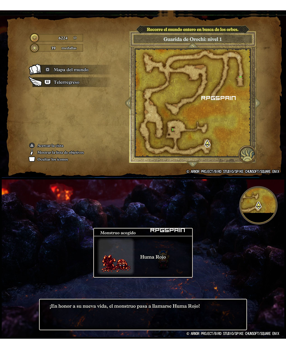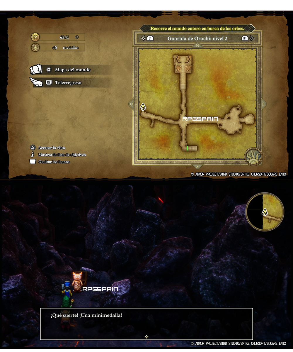 Ahora podemos visitar el palacio y a la reina que pasará de nosotros completamente, por lo que saldremos de la ciudad y nos dirigiremos al este hasta encontrar una cueva donde está la guarida de Orochi. La mazmorra es bastante lineal aunque no te olvides de la mini medallas pertinentes, sobre todo de la que hay en la habitación al fondo a la izquierda (donde hay varios caminos y el de la derecha lleva al jefe).