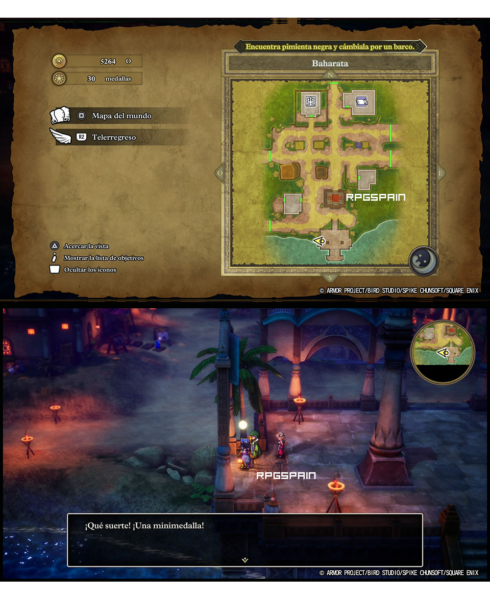 Trofeo de historia. Ahora que disponemos de la llave mágica, podremos irnos hacia la aduana de Romaria (al oeste de la ciudad) para usarla y pasar hacía Portoga. Allí tendremos multitud de mini medallas, monstruos y cofres para recoger. Nuestro objetivo principal será hablar con el rey de Portoga para que nos mencione su extraña adicción por la pimienta negra y que quiere que vayamos a Baharata para conseguirla. Con el permiso en nuestro poder, hablamos con el enano de la gruta de Tramontano (al noreste de Zalama) y pasamos todo el túnel hasta llegar a la nueva área.