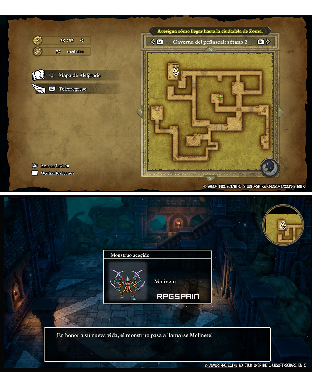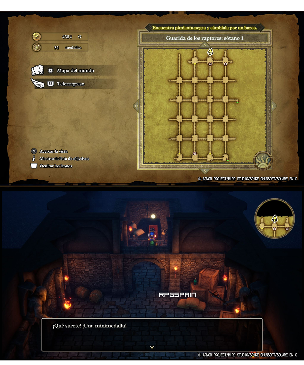 Ojo cuidado con esta mazmorra ya que hay muchísimos cofres que en realidad son cofres Pandora y pueden ser un dolor de muelas. Si tienes la vocación ladrón con la habilidad «ojear» (nivel 20-21) podrás saber si el cofre tiene tesoro o no (el color rojo significa que no y el azul es que sí). Seguimos el camino hasta que encontremos el sótano 2 y un agujero que hay justo abajo de las escaleras en las que aparecemos. Nos tiramos por él para recoger el espejo de Ra y ya podemos subir tranquilamente para coger todos los objetos (y bestiario). Volvemos a Manoza, por la noche, y entramos en el palacio hasta encontrar la alcoba del rey (hay que liar una buena hasta llegar, subiendo escaleras y tirándonos por la torre). Nada más interactuemos con él, veremos que nos dejará usar el espejo de Ra para que aparezca su verdadera forma.