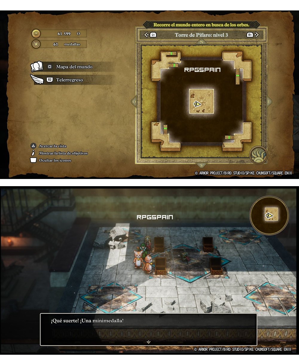 La torre tiene 3 salidas pero a nosotr@s nos interesa la escalera central para poder subir la torre. Tanto en en el piso 2 como en el piso 3 encontraremos mini medallas, cofres y una serie de monstruos también necesarios para el platino. En lo más alto podremos hablar con un señor que nos dará la llave del ladrón que será fundamental para continuar nuestra aventura.