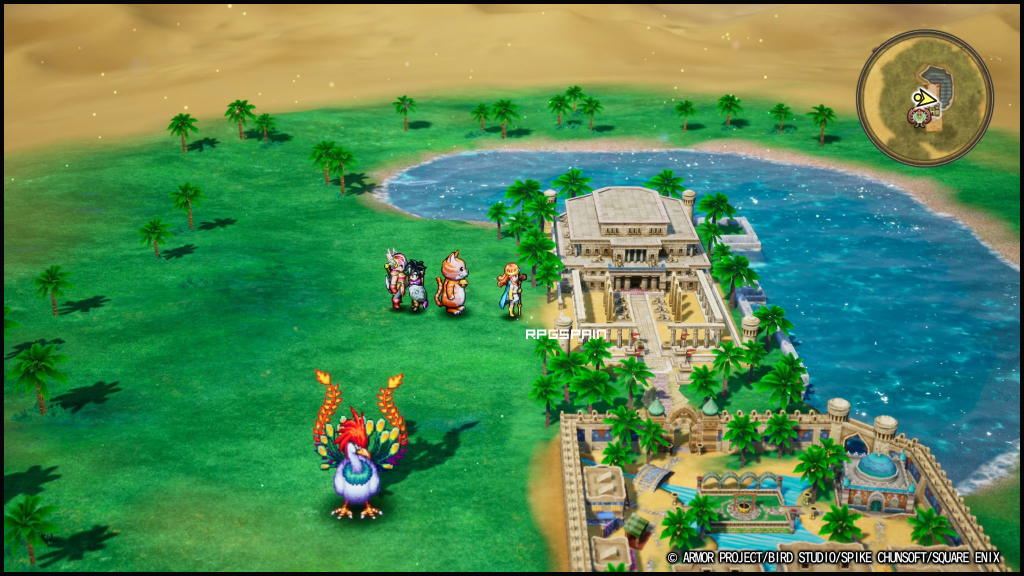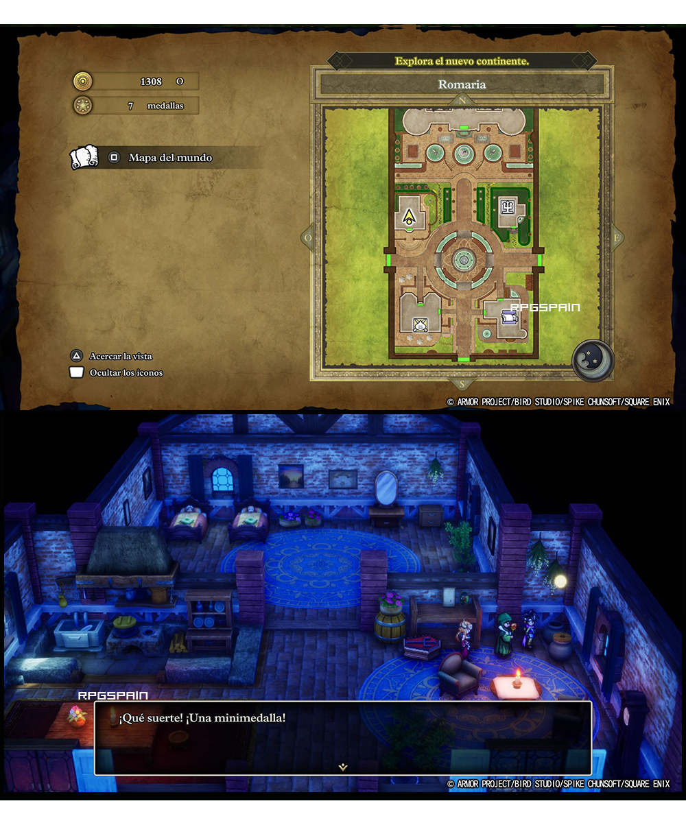 Ya en el mapamundi, seguiremos hacía el norte hasta Rivera (zona nueva por lo que encontraremos más monstruos) donde deberemos hablar con un anciano que tiene la bomba que necesitamos para abrir el paso hacía Romaria (y por supuesto cogemos las mini medallas que hay aquí). Aunque parece que esta cerca, lo cierto es que tendremos que ir hasta el sureste bordeando Aliana hasta llegar a un templillo (donde hay otra mini medalla) y al estanque que necesitamos para continuar la aventura.