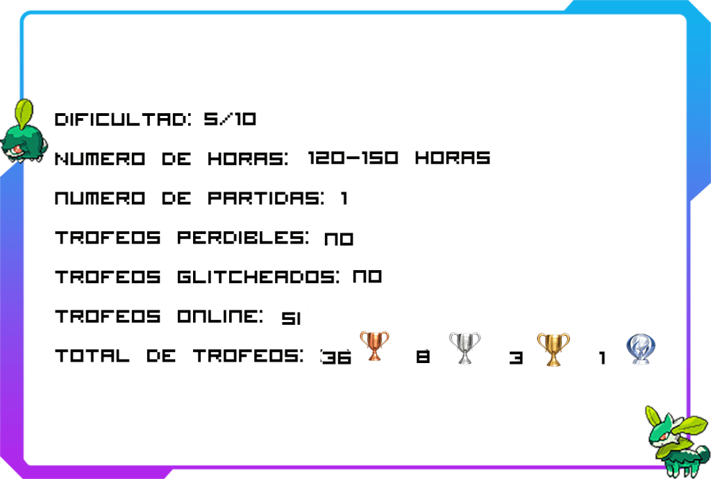 Bienvenid@s a la guia de trofeos de Temtem, un juego maravilloso que es muy parecido a la saga Pokémon y que dará multitud de horas de diversión. Tendremos que tener en cuenta que para poder jugarlo necesitaremos estar continuamente en modo online, por lo que puede llegar a ser más divertido de jugar con un compañero (aunque habrá trofeos que deberéis sacar de forma individual). Lo bueno es que Temtem no tiene ningún trofeo perdible así que podéis jugar tranquilamente a vuestro ritmo. Recomiendo mucho que juguéis la historia primero sin mirar mucho los trofeos, ya que en el PostGame los podremos hacer todos y de manera más fácil al tener mayor nivel en nuestros Tems.