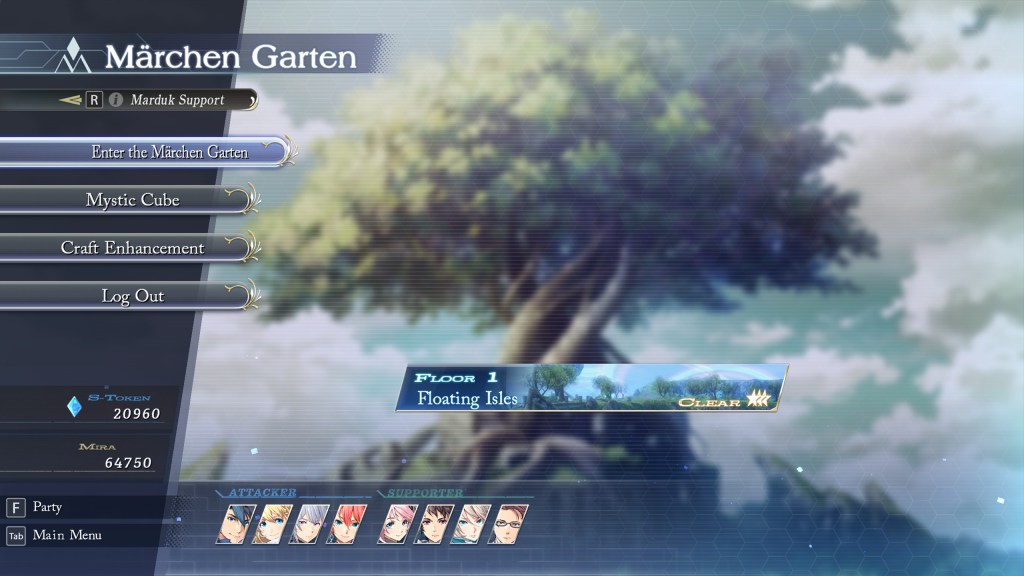 Se compone de 16 niveles de los cuales 9 tendremos que recorrer durante la trama principal y el resto forma parte del Postgame donde se encuentran tanto los jefes como los enemigos mas fuertes de todo el juego. Para avanzar entre zona y zona debemos cumplir una serie de objetivos como matar a X enemigos de cierto tipo, romper elementos del escenario o activar la magia de ciertos artefactos. Al completar cada zona recibimos una recompensa a elegir entre tres disponibles y pasamos al mapa del nivel donde estamos pudiendo elegir distintos caminos, donde se nos indica previamente cual va a ser la recompensa del camino y los tipos de enemigos que nos encontraremos. Al final de cada nivel tendremos que enfrentarnos a un poderoso enemigo final y al personaje que mejor rendimiento obtuviese se le recompensara con la mejora de ciertas Stats y con unos objetos denominados Stones y que acompañan al nombre de cada personaje en el que podemos usarlas. Estas Stones tienen como función la de mejorar las Craft y S- Craft de nuestros personajes por lo que merece la pena pasar a menudo a hacernos alguna pasada por los niveles de Marchen Garten. A esto le sumamos que cuantas más veces completemos cada nivel mejores bonuses de recompensa obtendremos hasta un máximo de tres veces por nivel.